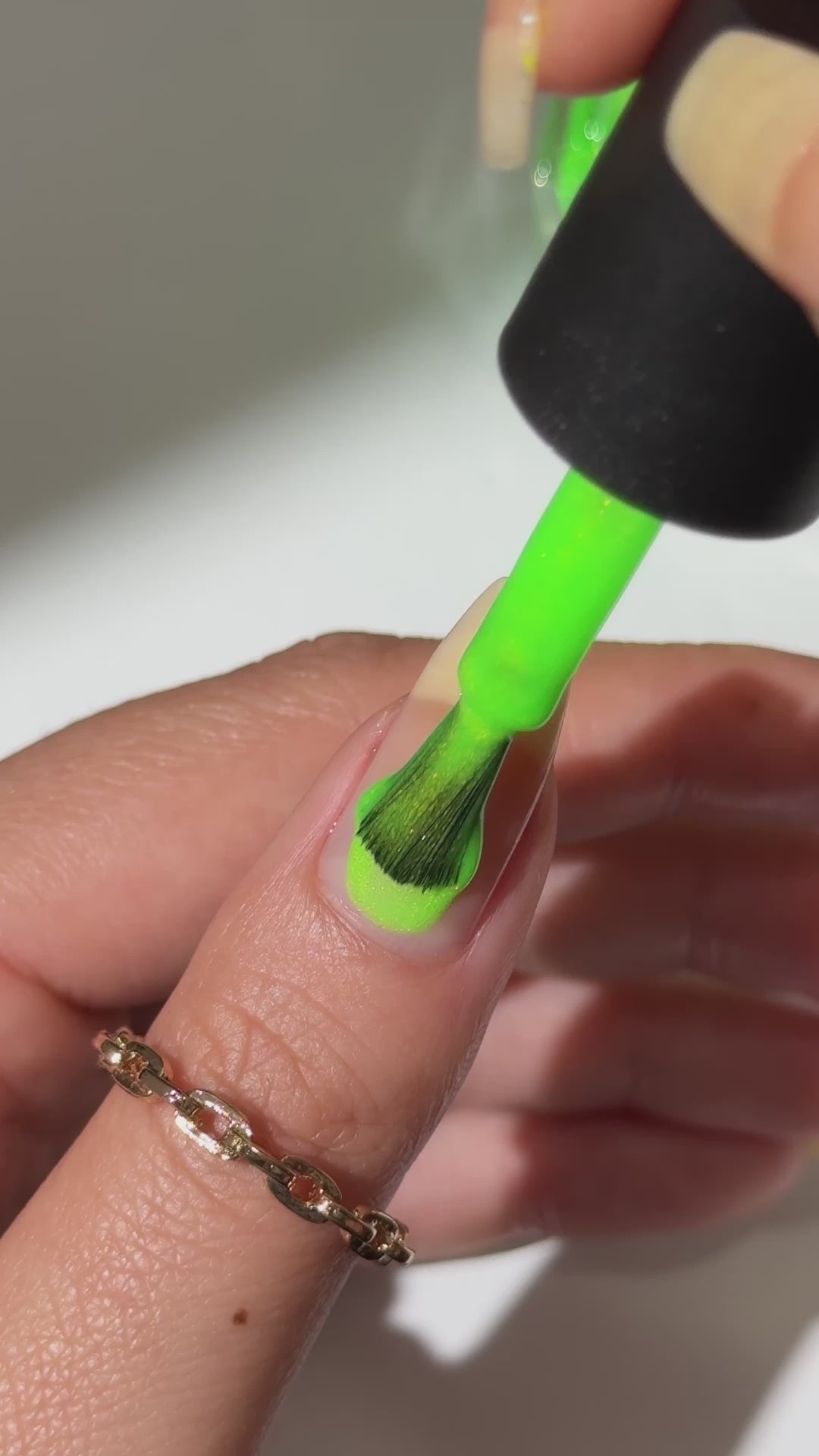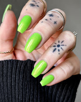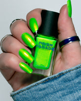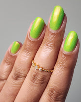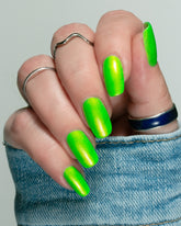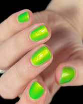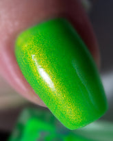 Mallbrat is a neon green lacquer with red to gold shimmer.