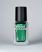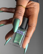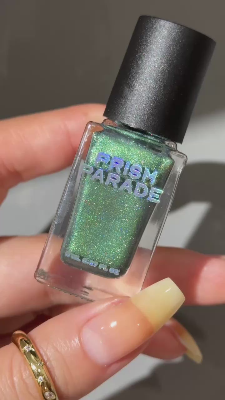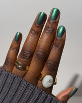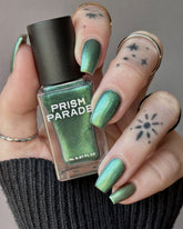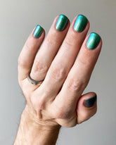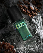 Frozen Hollow is a frostbitten sage lacquer with glowy green shimmer and microfine holographic glitter.