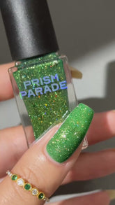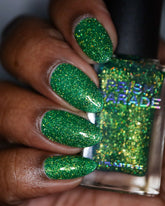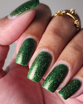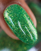 Resting Grinch Face is a green jelly polish with gold shimmer, gold and green reflective glitter, and gold holographic glitter. Limited through December only.