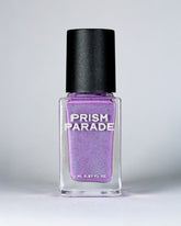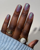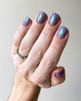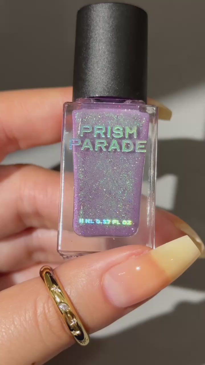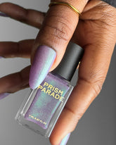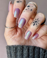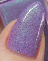Shiverscale is a lavender-hued lacquer with mesmerizing green shimmer, laced with purple reflective glitter and microfine holo.